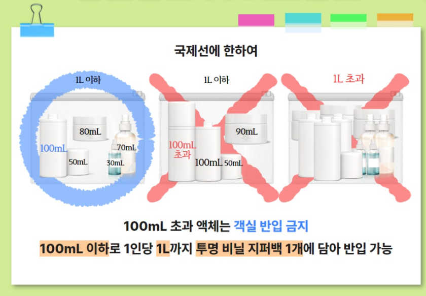 - 액체류: 국제선의 경우, 100ml 이하의 용기에 담긴 액체만 반입 가능하며, 투명하고 재밀봉 가능한 비닐봉투에 넣어야 합니다. 국내선에서는 다소 완화된 규정을 적용할 수 있습니다.