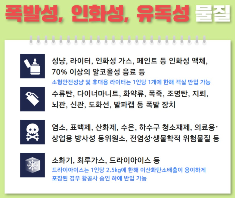 안전하고 원활한 여행을 위해, 폭발성·인화성·유독성 물질의 반입 규정을 준수하고 필요한 준비를 마쳐 두시기 바랍니다. 이를 통해 불필요한 불편을 피하고, 안전한 비행을 즐길 수 있습니다.