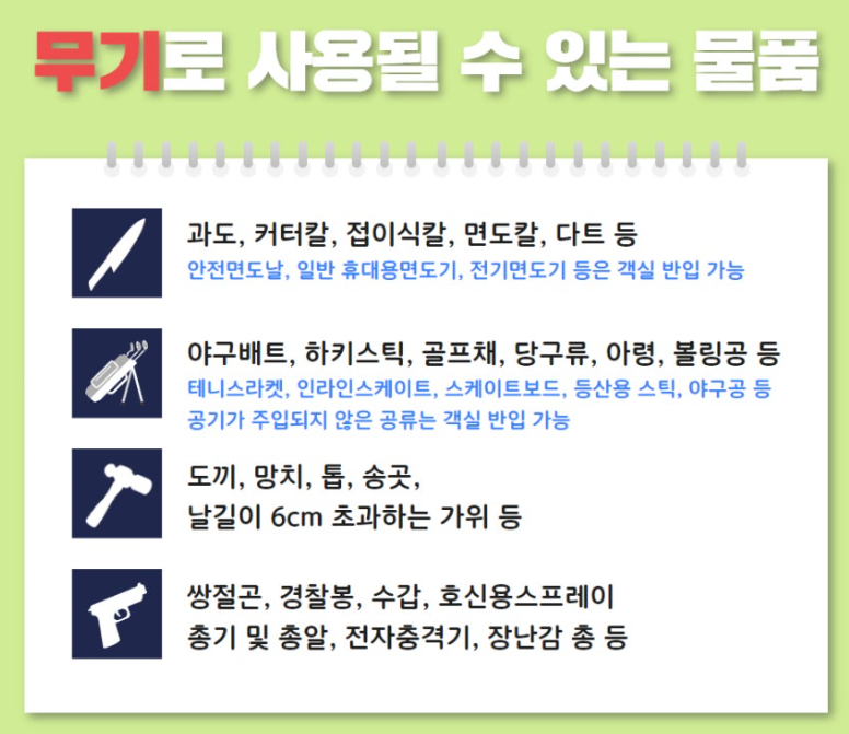 비행기 여행 시, 우리의 안전을 위해 기내반입이 금지된 물품이 있는데요. 특히, 무기로 사용될 수 있는 물건은 기내에 반입할 수 없습니다.